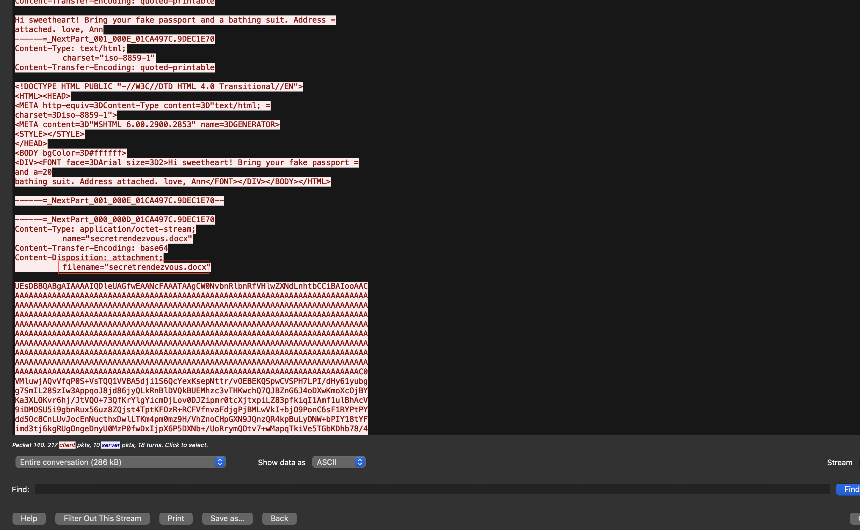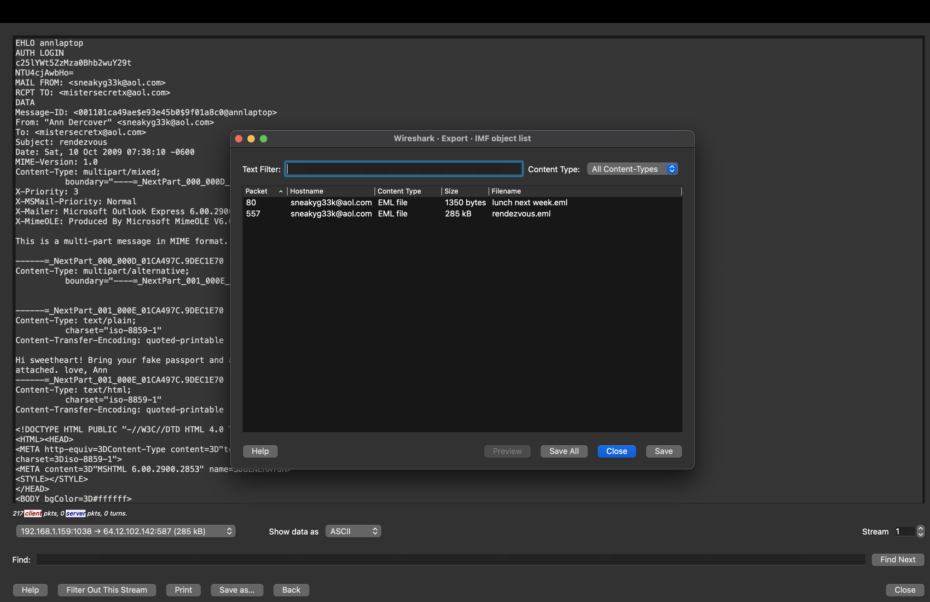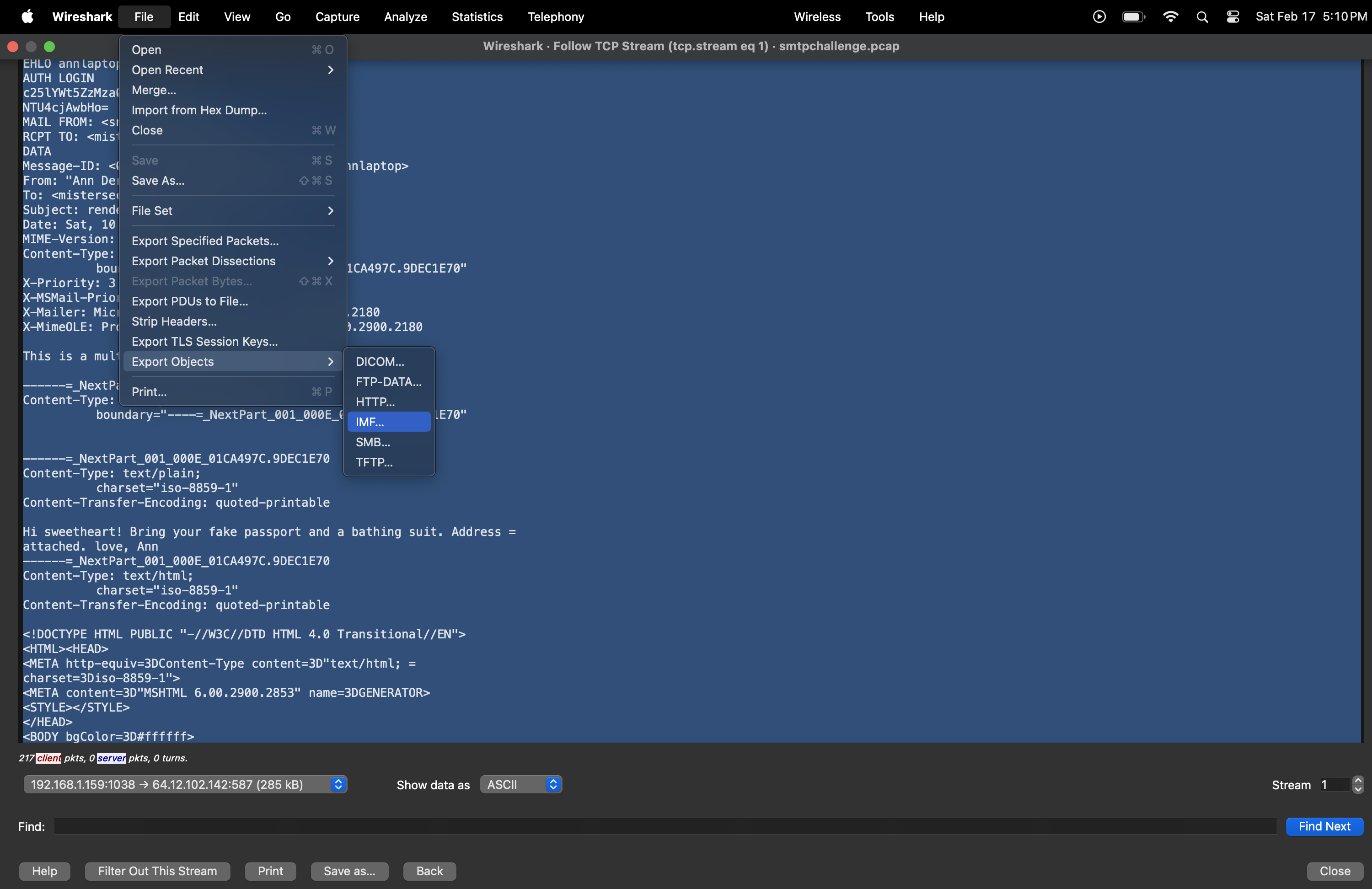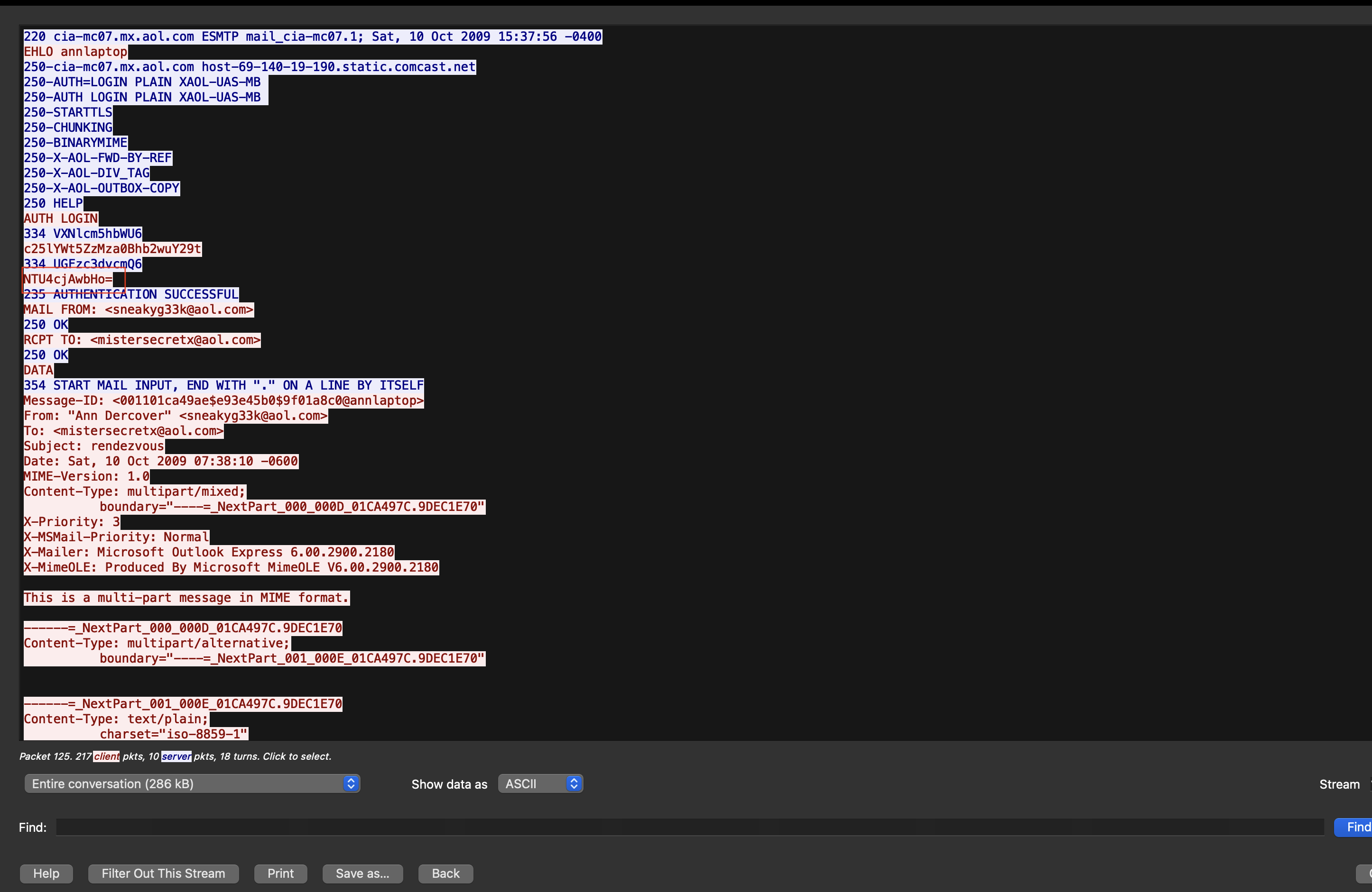 Method: Filter SMTP packets and follow TCP Stream.